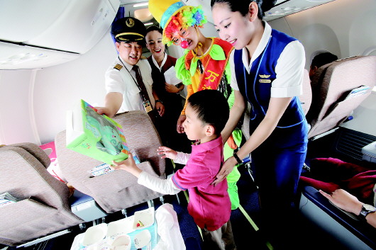 6月1日,山航携手青岛万达·海公馆,在青岛当天始发的所有航班启动“空中快闪”送惊喜活动。乘务组在万米云端为乘客和小朋友送上节日的祝福和精美礼物,更有滑稽小丑“快闪”表演气球魔术。 (包一成)