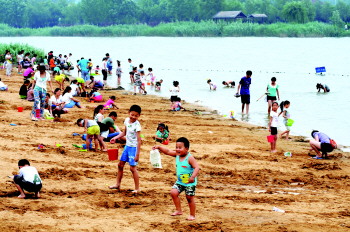 6月15日,在减河湿地风景区的亲水沙滩上,挤满了戏水的孩子,给人一种置身海滨的感觉。