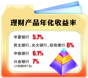 此外,民生银行、光大银行、招商银行等银行的理财产品预期年化收益率达到了6%左右,相比上周普遍提高了0.5个百分点。其中,兴业银行的一款大额理财产品预期年化收益率更是超过了7%。