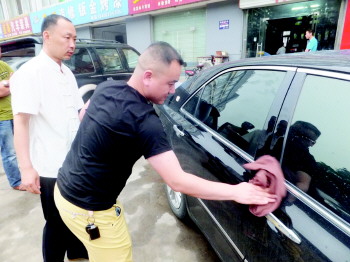 韩先生拿抹布在车身上擦掉灰尘,一块均匀的油漆点显示出来,油漆点直径不足0.5毫米。整个车身、四周玻璃,均匀落上一层油漆,用抹布也无法清理。在酒店门口停车位上,一辆白色本田CRV和他的车遭遇同样情况。“这辆车也是住店顾客的,车主到现在还不知道呢。”韩先生说,跟酒店负责人商量补偿方式,但酒店认为责任在“喷漆”一方,酒店门口也挂着“免费停车,不提供车辆照看服务”告示牌,拒绝赔偿。