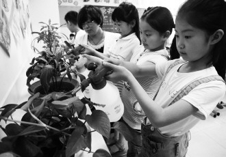 15日上午,新都小学学生正在为自已种植的鲜花浇水。为培养学生热爱自然、亲近自然的能力,新都小学开展一人一盆植物活动,让学生种植绿色植物,更加贴近自然。