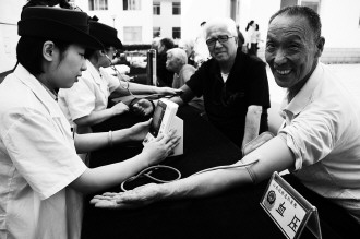 15日,武警山东边防总队医院医护人员从济南赶到威海,为当地武警官兵和敬老院以及社区老人免费义检,包括内、外科,耳鼻口科、透视和心电图检查等。