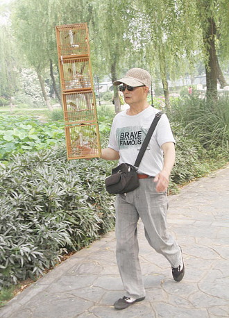 时间:2014年6月8日 自述:这师傅单手举着四个鸟笼,一边晨练,一边遛鸟。 点评:师傅,好拉风。