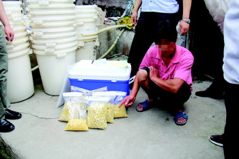 进入其中一个房间,有同样的三十多个塑料桶,其中有的豆芽已经发得很好了。民警在这个黑作坊里面抓获两名嫌疑人,同时找到了制作问题豆芽的添加剂“AB粉”110包、“AB水”810支,查获“毒绿豆芽”成品、半成品1950公斤。