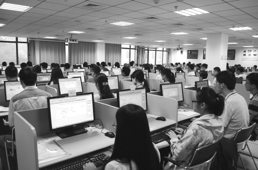 16日上午,记者在山东大学高考阅卷现场看到,数百名评卷员正在阅卷机房内认真批阅试卷。对于每一道题目,阅卷人员都严格对照评分标准,找出所答题目的得分点。
