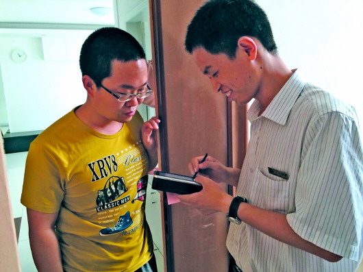 记者来到402室,说明情况后,业主王先生用身份证在刷卡器上轻轻一刷,就出现了维修部位、预算等详细信息,听物业经理讲完有关事宜后,王先生表示“同意”。整个过程仅四五分钟。