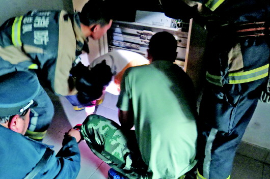 省城解放东路一处电梯“罢工”,消防战士采用液压工具破门救人。(资料片)