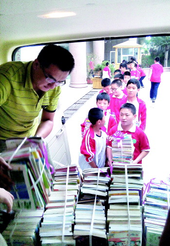 ◥孩子们排队把爱心图书装车。 本报记者 肖龙凤 摄