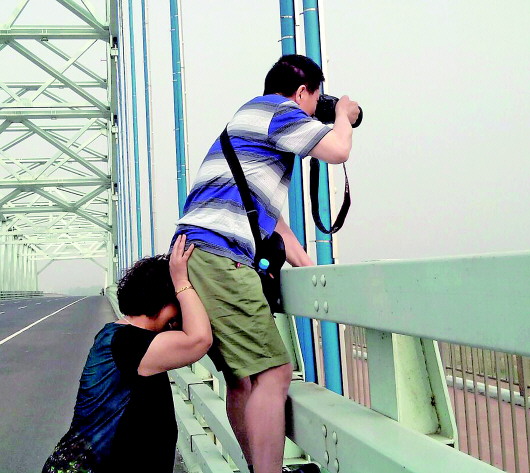 自述:栏杆上不好站人,老伴儿来助一臂之力。