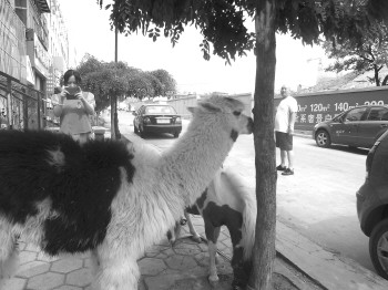 本报6月16日讯(记者 王敏) 高约1米的身躯、健硕的四肢、骆驼般的长脖子、稍显窄长的脸,这只长相奇特的动物16日突然和一匹矮马出现在海滨小区,立刻引来居民们的围观。“哎——羊驼!”一名小朋友喊了出来,以前只能在动物园中看到的稀罕物引起众人的极大兴趣。