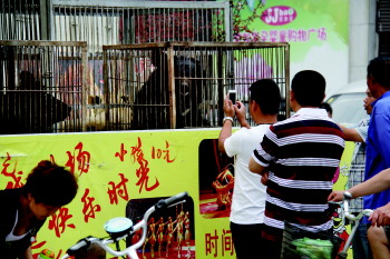 6月16日,在三八西路与迎宾大道交叉口西北角,一辆小火车上的黑熊、狮子等动物吸引市民围观。据了解,几只动物是跟随准备在此演出的马戏团而来。 本报记者 王小会 摄