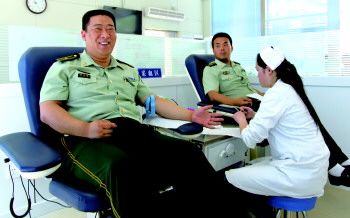 在第11个世界献血日来临之际,乐陵市消防中队的14名官兵来到该市无偿献血屋义务献血。短短两个小时内,无偿献血4300毫升。 (赵光 李娜)