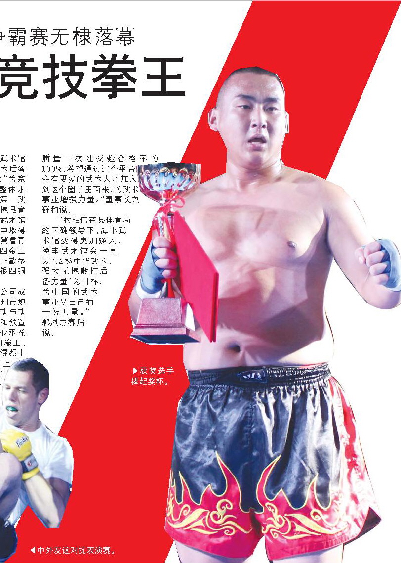 “我相信在县体育局的正确领导下,海丰武术馆变得更加强大,海丰武术馆会一直以‘弘扬中华武术,强大无棣散打后备力量’为目标,为中国的武术事业尽自己的一份力量。”郭凤杰赛后说。