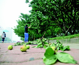 16日,高区鞍山路通往国际海水浴场的南北路,一市民正在采摘道路两旁的杏子。眼下正是杏子成熟季,该路段道路两旁约栽有20余棵杏树,许多市民爬树随意采摘,既破坏了树木的生长,折断的树枝也给市民出行带来不便。(请市民苗先生到本报威海记者站领取新闻线索费50元)