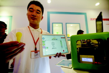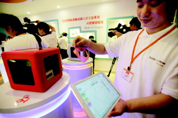 “我们只需要在智能手机或iPad的触摸屏上手绘出平面图形,任意调整尺寸并旋转,这个平面图形就会立即变为立体图形,再通过Wi-Fi把这个图形传送到3D打印机上,就可打印出一个立体物品。”汤敏说,这款3D打印机使用绿色环保的聚乳酸塑料作为打印耗材,一台机器的长、宽、高都只有30厘米,非常适合家庭和学校使用。