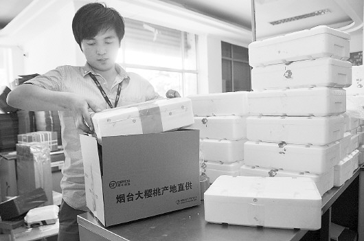在顺丰快递配送站,从果园直接采摘的大樱桃被放上冷源保鲜后打包准备发往目的地。 见习记者 吕奇 摄