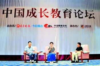 ◤中国教育在线总编辑陈志文(右一)与烟台二中老师孙英战(左一)、烟台三中老师姜庆燕(左二)在论坛上,针对高三毕业生填报志愿问题各自发表意见,并解答现场观众的疑惑。