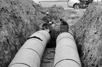 6月16日,在岔河东岸供暖管道下穿大学路段,施工人员正在焊接管道,为冬季供暖工作做准备。 本报记者 马志勇 摄