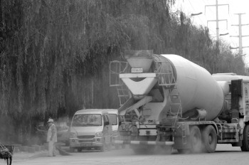 6月17日,华润路两旁,多处建筑工地的施工车辆未经抑尘处理频繁进出,扬起的沙尘笼罩在道路上空,给过往的行人和周边居民造成诸多不便。 本报记者 马志勇 摄