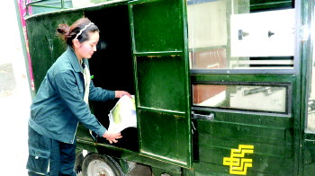 王珍在往邮车上放报纸。 本报记者 张建丽 摄