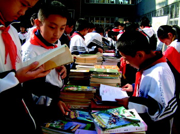 学校的读书节中,学生交换好书,品味经典。