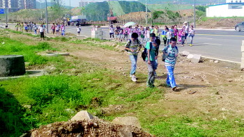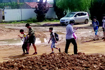 下午3点15分,伴随着放学铃声,东川路小学五年级的王德超和他的三个同伴飞快地跑出校门,四人一走上校门口的土路,不约而同地提起裤腿,踮着脚尖小心翼翼地快速通过。“一到下雨天就不好走,一踩一脚泥。”一脸幼稚气的王德超说,要是碰到下大雨天,积水都能没到脚面,有时候踩下去鞋子都拔不出来。