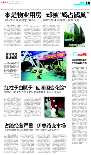 本报6月17日讯(记者 殷萍) 17日,本报报道了黄岛区阳光海岸小区物业用房被开发商“鸠占鹊巢”一事。当天记者联系了相关部门,规划部门称此事不在监管范围之内,城管部门则称尚无执法权限,被占用的物业用房遭遇无人监管的尴尬。