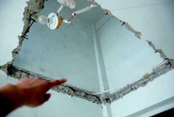 申先生买的新房,客厅与卧室的一面间隔墙被整体砸除(上图),阁楼的楼板也被凿了个大窟窿(下图)。 本报记者 赵发宁 摄