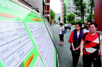 在淄博五中考点,考生和家长一起看考场。 本报记者 王鸿哲 摄