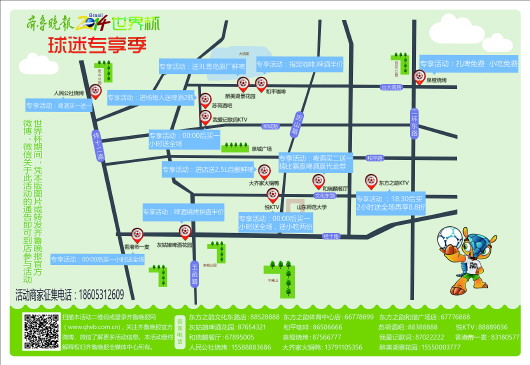 经过几天的走访调查,本报精选了多家泉城看球的好去处,在这里不仅能观看精彩纷呈的比赛,还能参与本报“世界杯球迷专享季”活动,享受本报专享优惠。高大上的比赛伴以凉爽啤酒、美食,重点是,这里有成群的世界杯发烧友,还能现场猜比分赢奖品,一定可以让你的这个世界杯不再寂寞。世界杯期间,凭本版图片,或转发本报微博、微信关于此活动的通告即可到店参与活动。