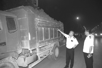 20时30分左右,执法人员在牡丹新城建设工地依法查扣2辆违规渣土车。记者看到,其中一辆车装载的渣土已高出车沿近1米,并未密封覆盖,不时有渣土从车上抛下。