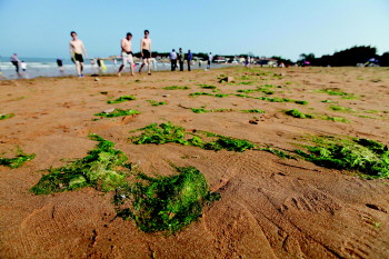 本报6月18日讯(记者 陈之焕) 18日,在团岛,八大峡海域出现浒苔,近日零星浒苔陆续登陆三浴、六浴等浴场及码头,浒苔大军距离青岛约40公里,将在几天后登陆。