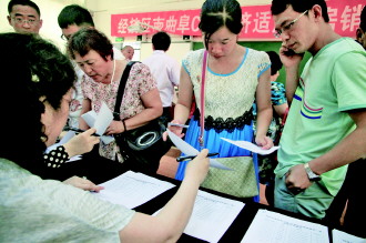 18日,经区南曲阜C区经适房销售公开摇号现场,随机电脑摇号过后,申请人正在领取选房通知单。 见习记者 丛子茗 摄
