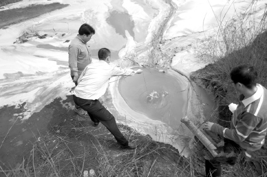 青岛环保执法人员对石墨公司排放的污水进行取样。 青岛市环保局供图