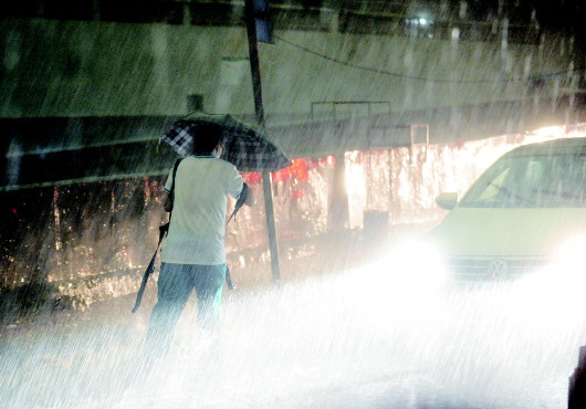 19日,济南迎来一场强降雨,下午6时许,行人在雨中撑伞前行。