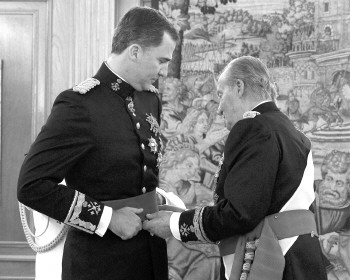 19日,卡洛斯一世(右)为费利佩六世系上象征统帅权的腰带。 新华/路透