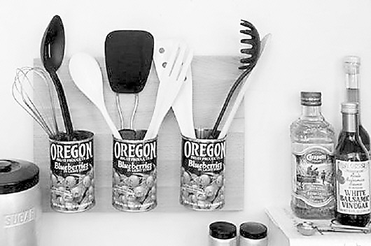 1、回收再利用一些装奶粉的铁罐,能够轻松而且环保地来存放一些物件,像这样作为放置烹饪工具的地方,如叉子和勺子之类的都可以,把它悬挂在墙上,还是个不错的艺术品呢。