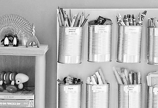 3、汤罐可以帮助孩子有条理地整理杂物。将孩子房间凌乱的杂物放进汤罐里。用粘接剂将多个汤罐统一粘接到一起。挂在孩子可以够着的地方,利用它们存放蜡笔、粉笔、彩笔以及一些小的玩具。