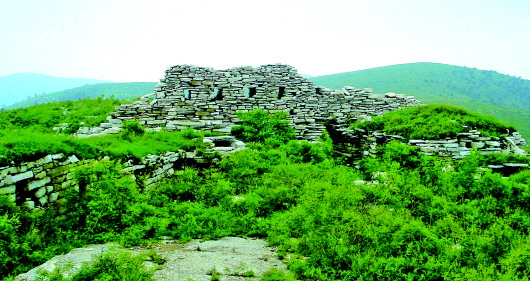 在这片核心区域稍向东的城中位置,建有四间大型石屋,这四间石屋孤立高耸,这应当是全城堡的首脑机关或指挥机关。站在这四间石屋的屋顶向周围望去,只见四野青山连绵,空中的苍鹰盘桓飞翔,齐长城从南面的山峰蜿蜒而来,穿过杜庄古城堡后继续沿山势向北逶迤而去,犹如苍龙,难见其头,更不见其尾。走出核心区后继续向西,便到了城堡最西面的一道城墙了。
