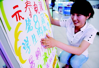 元泰电讯的工作人员正在张贴暑期促销的海报。本报记者 李岩松 摄