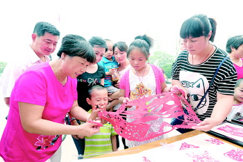 ▼民间剪纸艺人潘素琴(左一)现场向观众指导剪纸技巧。