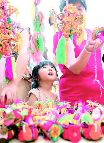 一位小女孩被民间“布老虎”系列手工艺产品吸引。