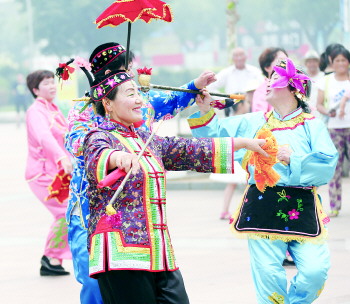 民间艺人表演非物质文化遗产项目“二仙斗”。