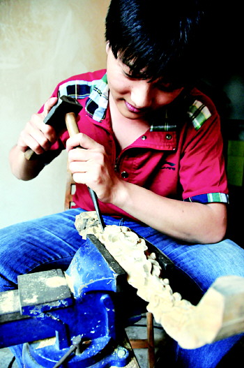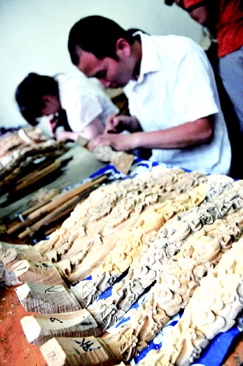 一间不大的工作间,两张陈旧的木桌,20多把大小不一的刻刀,这就是18日下午,记者在位于曲阜商贸城的一家楷木雕作坊内看到的场景。几名工人手持S形楷木原件,安静地雕刻着团。楷木上遍布着祥云、花束、仙鹤等图案,虽然看似有些粗糙,但已可以大体感受到如意的美感。