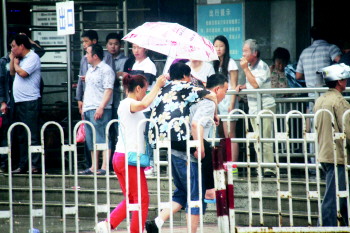 19日上午,受雨天影响,许多赶来坐车的旅客来不及打伞,冒雨疾走。图为一名中年人在雨中把一位老人背进候车室。 本报记者 王小会 摄