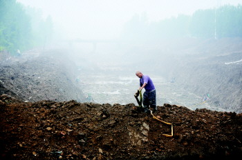 19日上午开始下雨,横河改造施工也遭遇排水问题,施工人员一边组织修筑围挡,阻止排水系统内的雨水进入施工现场,一边冒雨施工。 本报记者 马志勇 摄