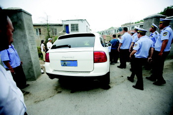 一辆保时捷卡宴越野车试图阻止执法车辆进入拆违现场。