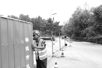 施工人员正在设置围挡。本报记者 李玉涛 摄