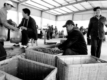 薄家口鲜叶市场内,茶商在收购鲜叶。 本报记者 李清 摄