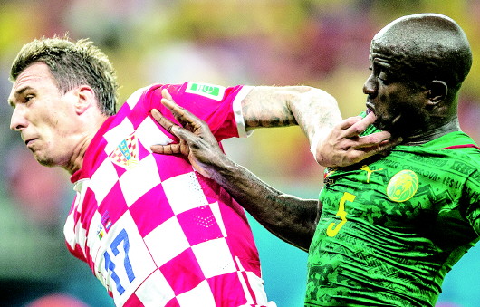 当地时间2014年6月18日,巴西,2014巴西世界杯小组赛,克罗地亚4:0喀麦隆。比赛中克罗地亚前锋曼朱基奇在与对方后卫达尼拼抢中将手伸进了他的嘴中。 新华社发